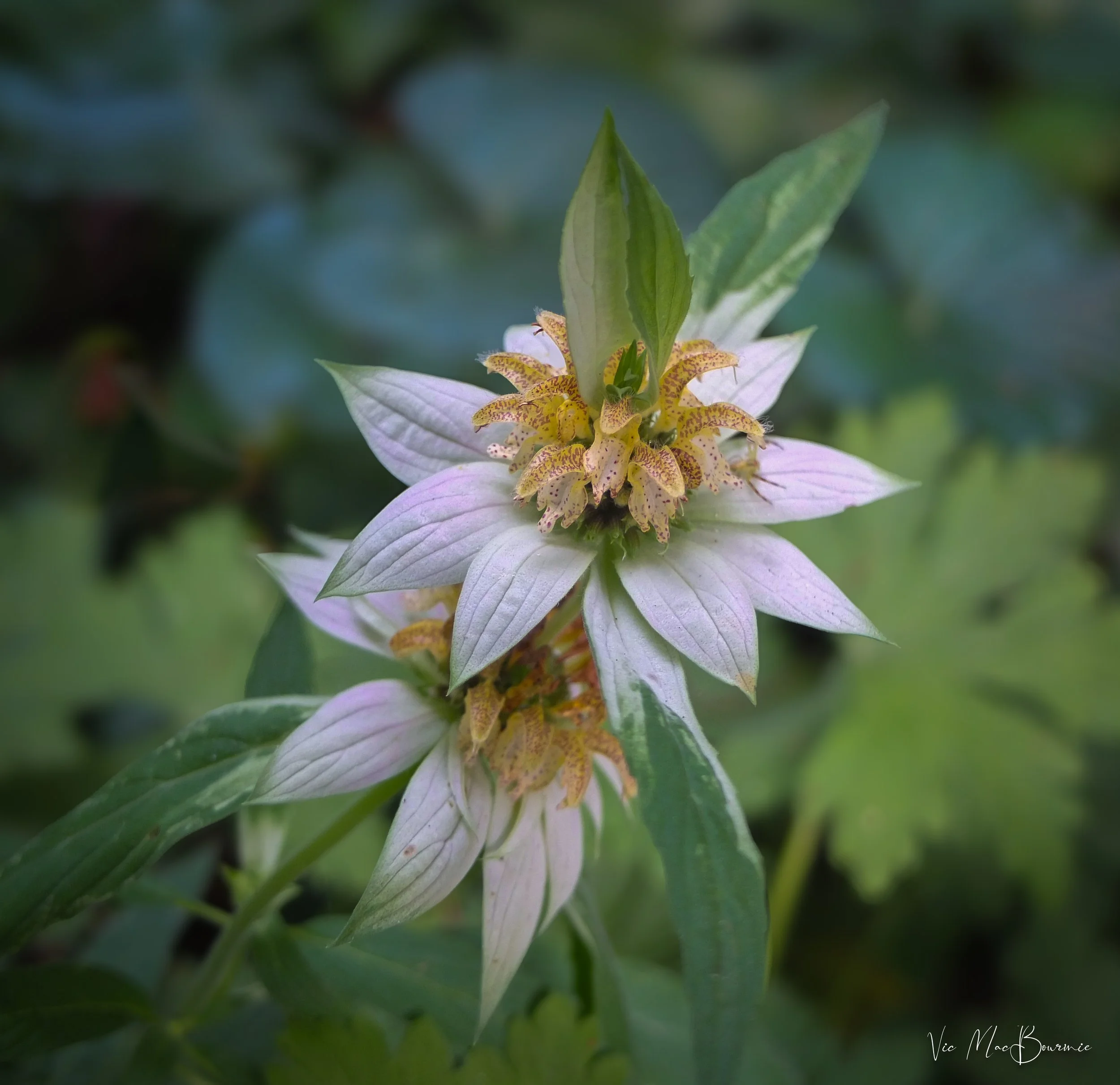 You could be excused for thinking this strange plant was a member of the orchid family. Its unique look, with several whorled flowers creeping up the stalk with small, tubular yellow florets painted with red spots surrounding pink-lavender leaf bracts that rise up the stalk in groups of three and more add a showiness that is truly a showstopper. The individual flowers are tubular, similar to the more traditional monarda flowers. They start off cream coloured but turn yellow with distinctive red and purple spots.